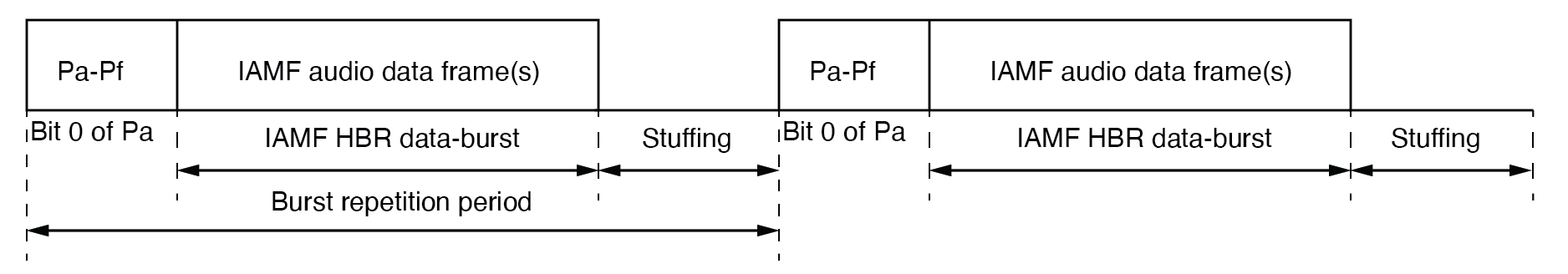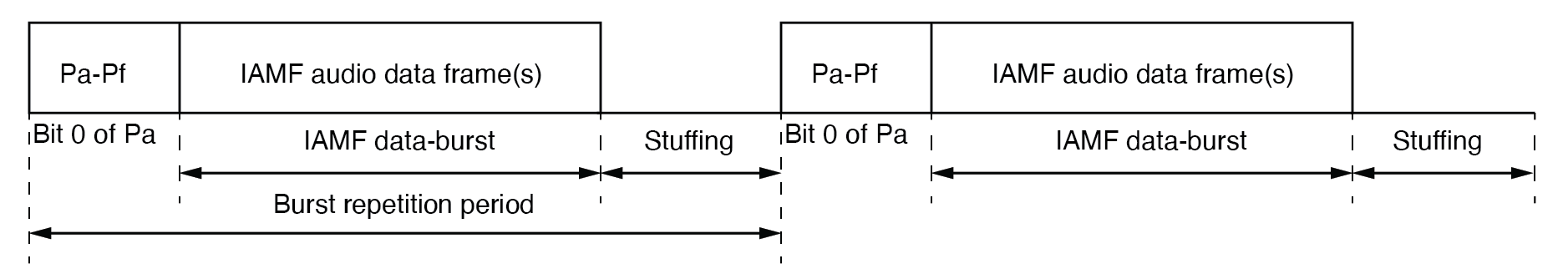 This clause specifies the IAMF data-burst. Specific properties such as reference points, repetition period, the method of filling stream gaps, and decoding latency are specified.The decoding latency (or delay) should be used by the transmitter to schedule data-bursts as necessary to establish synchronization between picture and decoded audio.