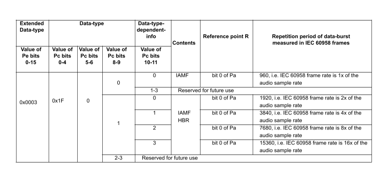 Pc bits 0 to 7 shall indicate extended data-type according to [IEC-61937-1] clause 6.1.8.3. As all bits are used in the preamble word of Pc, the value of data-type in Pc bits 0 to 4 is set to be 0x1F and the value of data-type bits 5 to 6 are set to 0. The extended data-type burst preamble Pe is used and the value is set to 0x0003. The 32-bit burst-info contains information about the data which will be found in the data-burst. (see Table 1).
