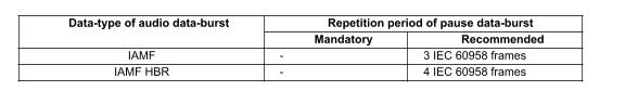 When a stream gap in an audio stream is filled by a sequence of pause data-bursts, the Pa of the first pause data-burst shall occur after exactly that number of IEC 60958 frames as indicated by the IAMF audio data-frame length in conjunction with the data-type-dependent information from Table 3. It is recommended that the sequence of pause data-bursts that fills the stream gap should continue from this point until the Pa of the first audio data-burst that follows the stream gap, or as close as possible to that point, considering the specific IEC 60958 frame length of the pause data-burst with respect to the IAMF audio data frame length. The repetition-period-length parameter contained in the pause data-burst is intended to be interpreted by the receiver as an indication of the number of decoded PCM samples that are missing (due to the resulting audio gap).
