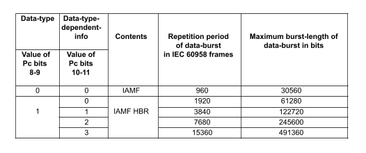 The Pc bits 8 to 9 indicate the IAMF bitstream mode. The repetition periods of data bursts in IEC 60958 frames shall be determined from the data-type-dependent information specified in Table 1.